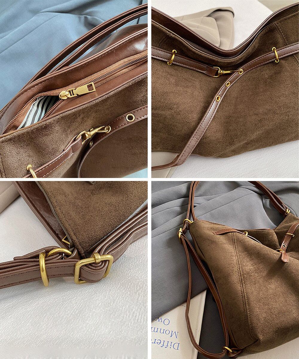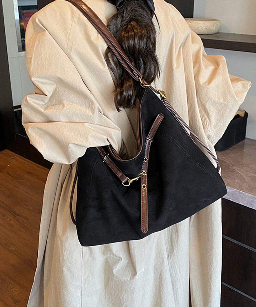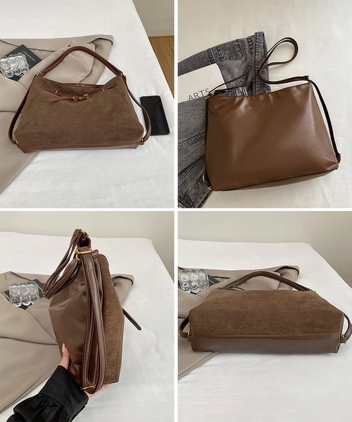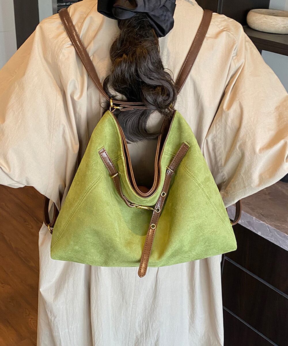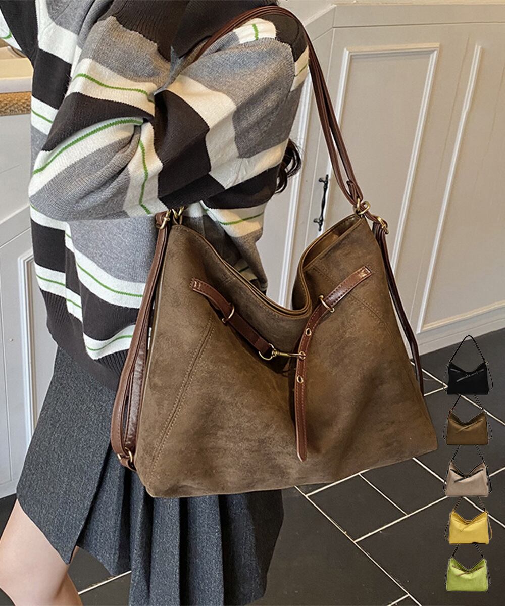 【商品説明】 ヴィンテージ感のあるスエード調とフロントベルトデザインがお洒落なトートバッグをご紹介! A4サイズも入る大容量で、通勤や通学、 デイリー使いにぴったり。 ショルダーベルトを変えるとリュックにもなり、 気分に合わせて3WAYで使える。 ・・・・・・・・・・・・・・・・・・・・・ 【カラー】 ブラック/ブラウン/ベージュ/イエロー/グリーン ※撮影条件等の違いによりで実際とは色合いが異なる場合があります。 ・・・・・・・・・・・・・・・・・・・・・ 【サイズ】ワンサイズ 高さ:約26cm 上横幅:約36cm 底横幅:約41cm マチ:約13cm ショルダー:約46-85cm(調節可能、取り外し不可) ■収納について ・A4対応(22×31cm):〇 ・iPadmini対応(19.6×13.5×0.7cm):〇 ・長財布(10×20cm):〇 ・二つ折り財布:〇 ・キーケース:〇 ・ペットボトル横向き(500ml):〇 ・ペットボトル縦向き(500ml):〇 重さ:約480g 裏地:あり 内ポケット:あり 生産国:中国 ※商品を平らな台に置いてメジャーで計測した平置き実寸サイズです。 ※現物と若干の誤差がある場合がございます。予めご了承くださいませ。 ・・・・・・・・・・・・・・・・・・・・ 【素材・成分】 素材:ポリエステル+合成皮革 ・・・・・・・・・・・・・・・・・・・・・ 【納期について】 ※この商品は、国内倉庫より3営業日以内で発送します。 商品番号:TZM-329 ご注文前に必ずご確認ください。 https://bloomlatte.base.shop/items/27485852
