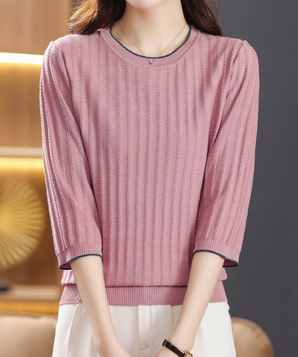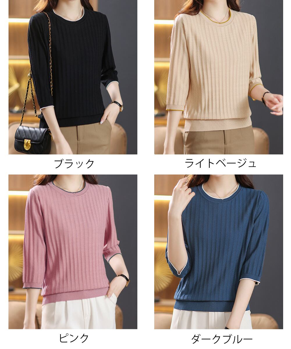 【商品説明】 マルチリブ編みがおしゃれ、クルーネックデザインの七分袖ニットトップスをご紹介! 程よくゆったりフィット、すっきり見えしつつ着心地も軽やかな一枚。 単品使いはもちろん、ジャケットやカーディガンのインナーとしても相性が抜群。 ・・・・・・・・・・・・・・・・・・・・・ 【カラー】 ブラック/ライトベージュ/ピンク/ダークブルー ※撮影条件等の違いによりで実際とは色合いが異なる場合があります。 ・・・・・・・・・・・・・・・・・・・・・ 【サイズ】ワンサイズ 着丈:約61cm 肩幅:約39cm 袖丈:約35cm ゆき:約54.5cm 身幅:約52cm 胸囲:約104-128cm 裏地:なし 伸縮性:あり 透け感:ややあり ※デザイン上透け感がございますので、インナーの着用をおすすめ致します。 生産国:中国 ※商品を平らな台に置いてメジャーで計測した平置き実寸サイズです。 ※現物と若干の誤差がある場合がございます。予めご了承くださいませ。 ・・・・・・・・・・・・・・・・・・・・ 【素材・成分】 素材:レーヨン89%+ナイロン11% ・・・・・・・・・・・・・・・・・・・・・ 【納期について】 ※この商品は、国内倉庫より3営業日以内で発送します。 商品番号:87YIMA-001 ご注文前に必ずご確認ください。 https://bloomlatte.base.shop/items/27485852
