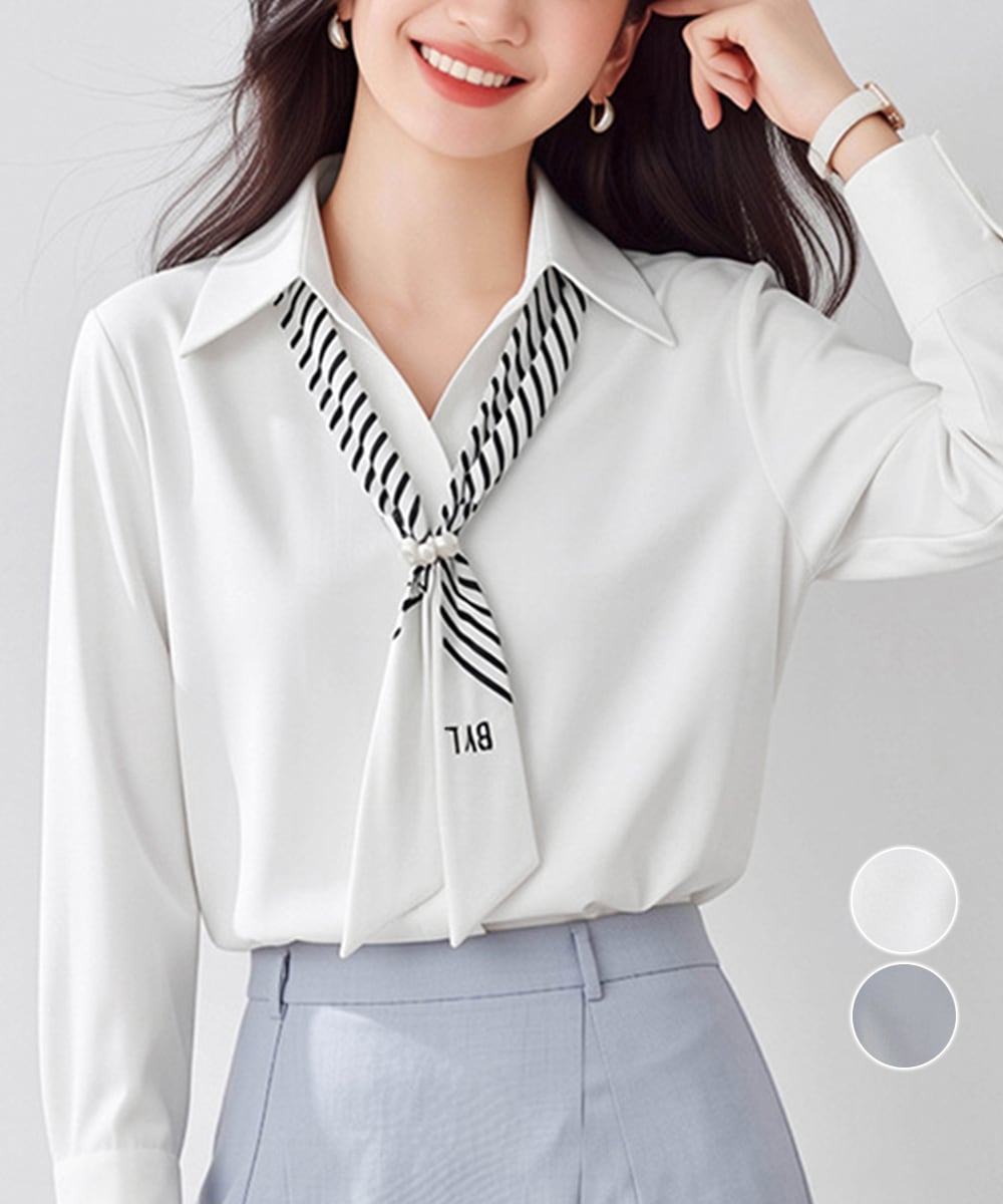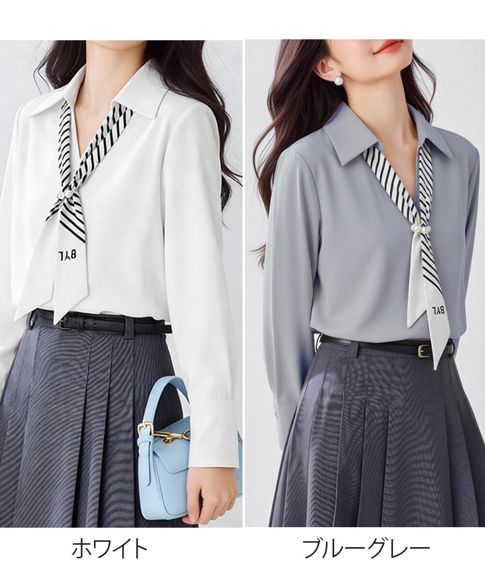【商品説明】 アクセントになるスカーフタイとパール調パーツが目を引く、上品なシャツブラウスをご紹介! ストライプ柄のタイが顔周りを華やかに演出し、これ一枚で知的な印象に導く。 とろみのある柔らかな素材で肌触りが良く、フェミニンかつ大人っぽい雰囲気に仕上がる。 タイとパールリングを外せば、シンプルなきれいめシャツとしても着用可能。 オフィスやデートシーンなどオンオフ問わず幅広く活躍する、大人女性に嬉しいアイテム。 ・・・・・・・・・・・・・・・・・・・・・ 【カラー】 ホワイト/ブルーグレー ※撮影条件等の違いによりで実際とは色合いが異なる場合があります。 ・・・・・・・・・・・・・・・・・・・・・ 【サイズ】M/L [M]着丈:約64cm 肩幅:約38cm 袖丈:約52cm ゆき:約71cm 身幅:約49cm 胸囲:約98cm [L]着丈:約66cm 肩幅:約40cm 袖丈:約54cm ゆき:約74cm 身幅:約51cm 胸囲:約102cm 裏地:なし 伸縮性:なし 透け感:ホワイトのみ若干あり 生産国:中国 ※商品を平らな台に置いてメジャーで計測した平置き実寸サイズです。 ※現物と若干の誤差がある場合がございます。予めご了承くださいませ。 ・・・・・・・・・・・・・・・・・・・・ 【素材・成分】 素材:ポリエステル100% ・・・・・・・・・・・・・・・・・・・・・ 【納期について】 ※この商品は、国内倉庫より3営業日以内で発送します。 商品番号:84LIUJIE-007 ご注文前に必ずご確認ください。 https://bloomlatte.base.shop/items/27485852