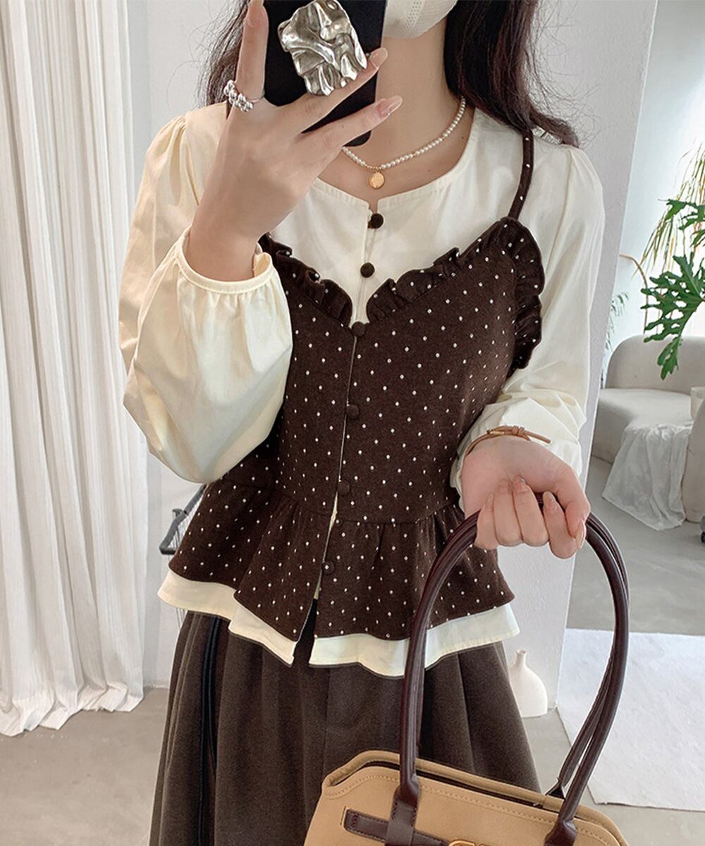 【商品説明】 ドット柄ビスチェを重ねたようなフェイクレイヤード風長袖ブラウスをご紹介! 程よく開いたラウンドネックがデコルテをきれいに見せ、顔まわりをすっきり。 フリル付きのビスチェデザインが、さりげなく可愛らしさをプラスする。 切り替えデザインと立体シルエットで、ラフながらもこなれたカジュアルスタイルに。 スカートでフェミニンに、パンツと合わせてきれいめカジュアルにも使え、一枚で着映えする。 ・・・・・・・・・・・・・・・・・・・・・ 【カラー】 ブラック/グレー/アイボリー/ブラウン ※撮影条件等の違いによりで実際とは色合いが異なる場合があります。 ・・・・・・・・・・・・・・・・・・・・・ 【サイズ】ワンサイズ 着丈:約50cm 肩幅:約34cm 袖丈:約58cm ゆき:約75cm 身幅:約49cm 胸囲:約98cm 裏地:なし 伸縮性:なし 透け感:淡色部分ややあり 生産国:中国 ※商品を平らな台に置いてメジャーで計測した平置き実寸サイズです。 ※現物と若干の誤差がある場合がございます。予めご了承くださいませ。 ・・・・・・・・・・・・・・・・・・・・ 【素材・成分】 素材:ポリエステル70%+綿30% ・・・・・・・・・・・・・・・・・・・・・ 【納期について】 ※この商品は、国内倉庫より3営業日以内で発送します。 商品番号:2HCHENG-001 ご注文前に必ずご確認ください。 https://bloomlatte.base.shop/items/27485852