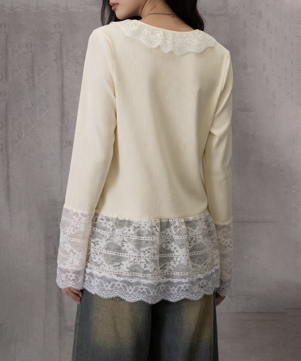 襟元・袖口・裾にレースをあしらった、フェミニンなロングTシャツをご紹介!