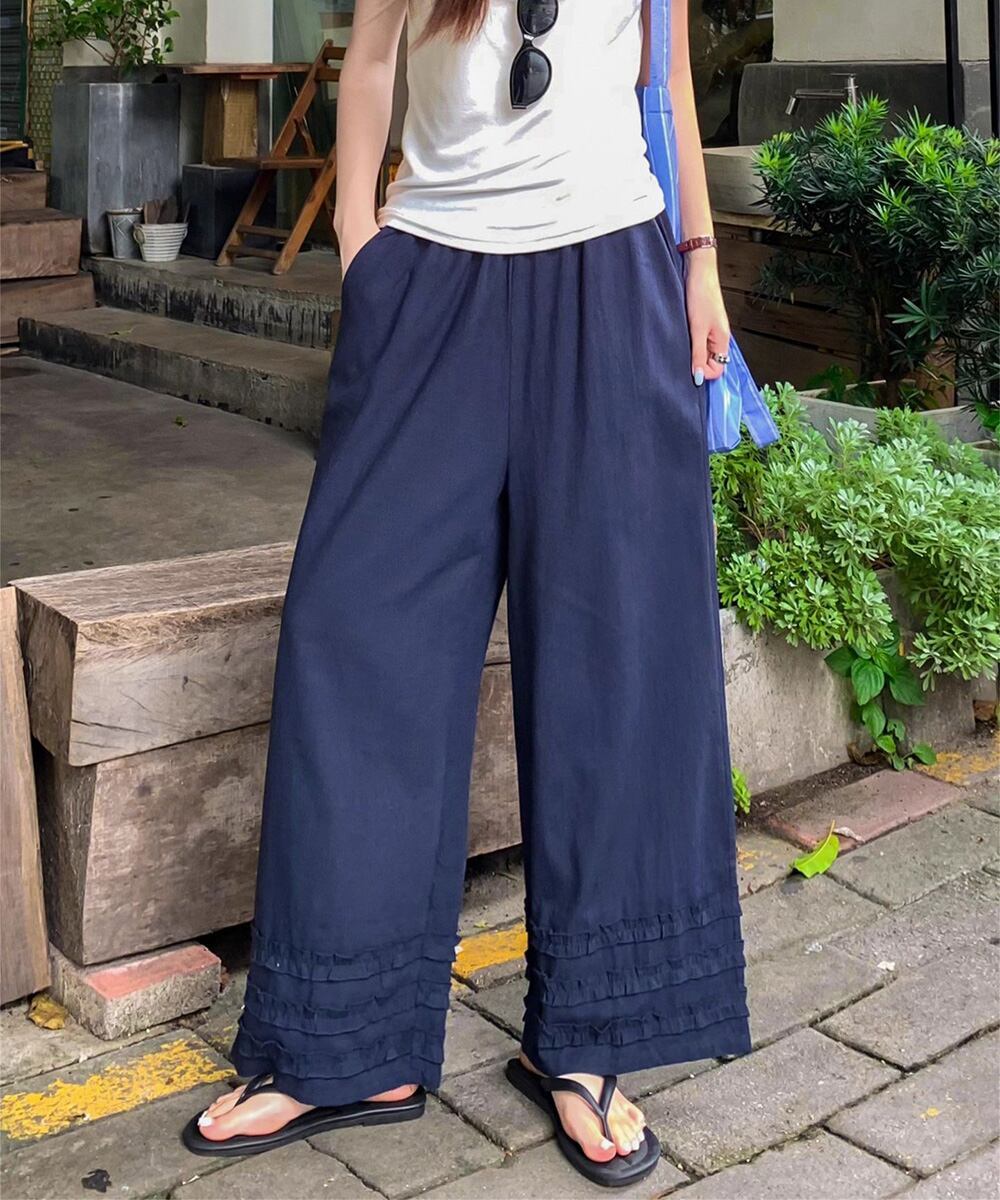【商品説明】 軽やかな落ち感が魅力のワイドパンツをご紹介! ウエストはリラックス感のある仕様で、長時間の着用も快適。 裾部分にあしらわれた段デザインが、甘くなりすぎず程よいアクセントに。 歩くたびに揺れるシルエットが、シンプルなコーデにさりげないニュアンスをプラスする。 ・・・・・・・・・・・・・・・・・・・・・ 【カラー】 アイボリー/ネイビー ※撮影条件等の違いによりで実際とは色合いが異なる場合があります。 ・・・・・・・・・・・・・・・・・・・・・ 【サイズ】M/L/XL [M]着丈:約89cm 股下:約57cm ウエスト(ゴム仕様):約46-66cm ヒップ:約94cm もも周り:約54cm [L]着丈:約90cm 股下:約58cm ウエスト(ゴム仕様):約50-70cm ヒップ:約95cm もも周り:約56cm [XL]着丈:約91cm 股下:約59cm ウエスト(ゴム仕様):約54-74cm ヒップ:約96cm もも周り:約58cm 裏地:なし 伸縮性:なし 透け感:アイボリーのみ若干あり 生産国:中国 ※商品を平らな台に置いてメジャーで計測した平置き実寸サイズです。 ※現物と若干の誤差がある場合がございます。予めご了承くださいませ。 ・・・・・・・・・・・・・・・・・・・・ 【素材・成分】 素材:ポリエステル100% ・・・・・・・・・・・・・・・・・・・・・ 【納期について】 ※この商品は、国内倉庫より3営業日以内で発送します。 商品番号:99CYDZ-005 ご注文前に必ずご確認ください。 https://bloomlatte.base.shop/items/27485852